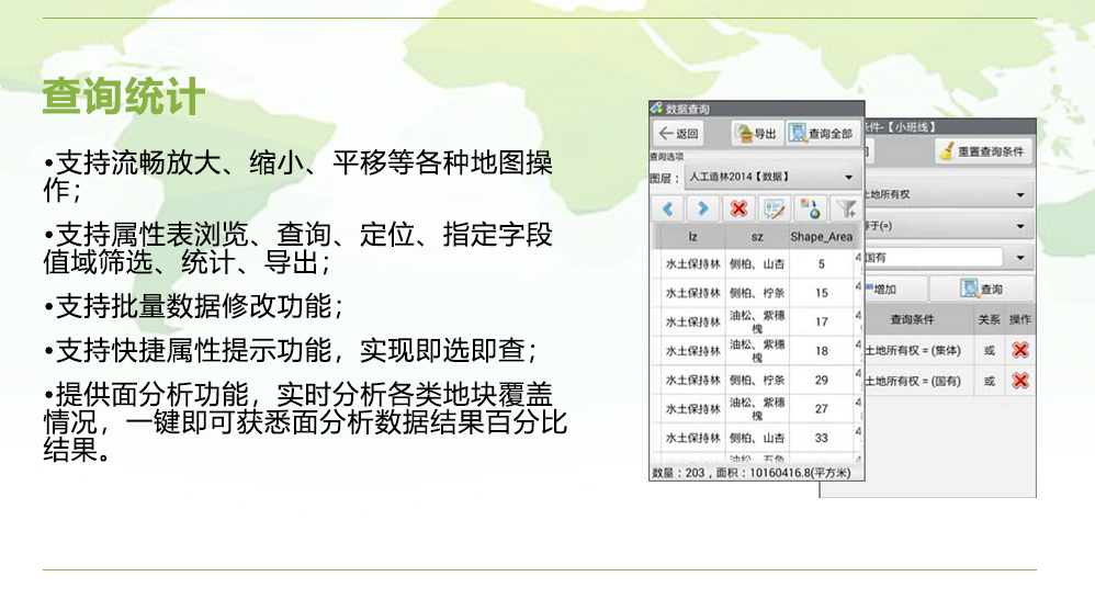 軟件可用于工程管理、圖層管理、林業(yè)數(shù)據(jù)采編、數(shù)據(jù)查詢統(tǒng)計、GNSS導(dǎo)航、航點航跡、外接GNSS高精度設(shè)備測繪等方面。