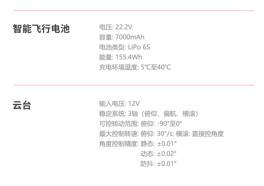14、智能飛行電池:支持現(xiàn)地一次同時(shí)充電三塊以上。 電池整體重量:不大于900g